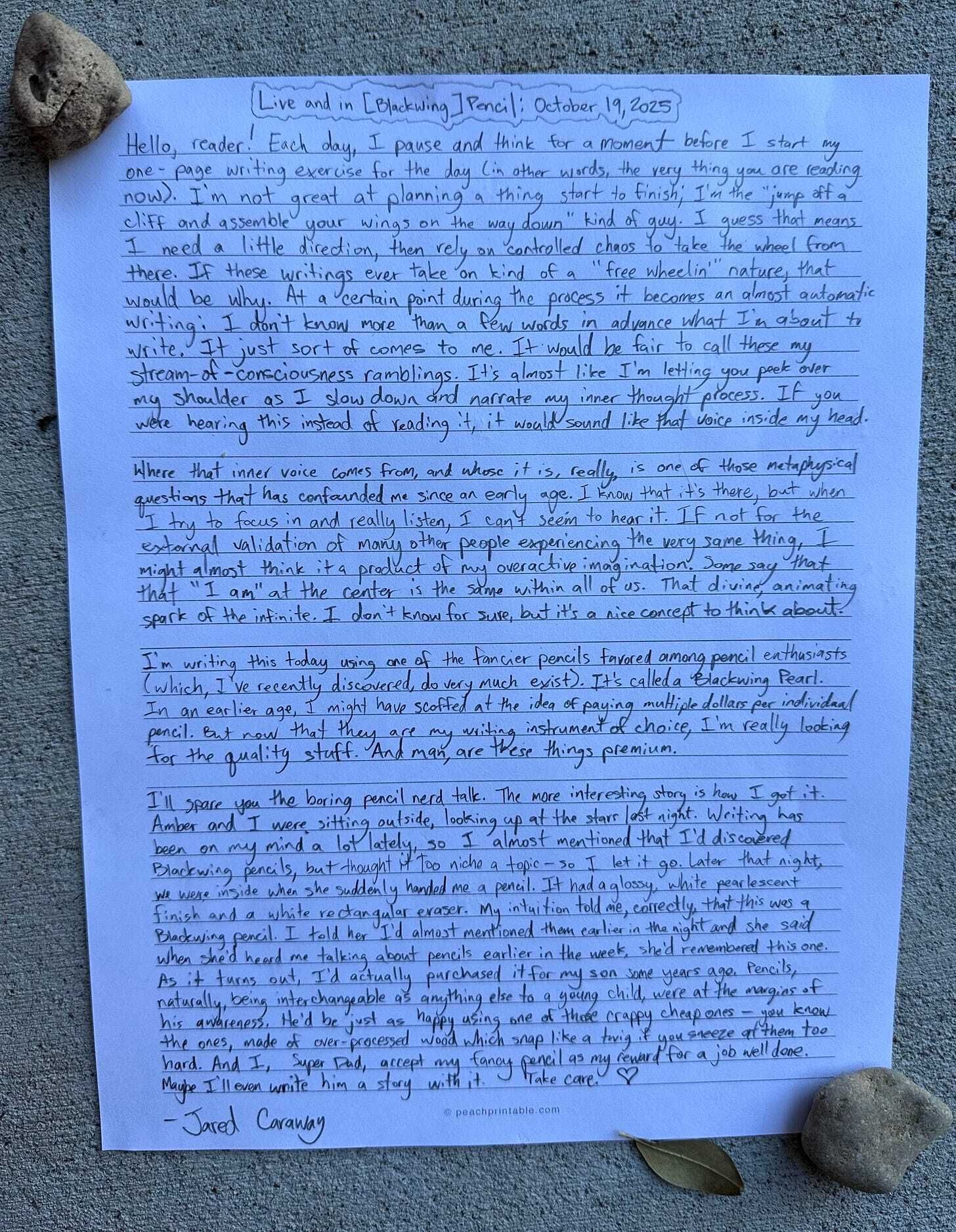 I’ll spare you the boring pencil nerd talk. The more interesting story is how I got it. Amber and I were sitting outside, looking up at the stars last night. Writing has been on my mind a lot lately, so I almost mentioned that I’d discovered Blackwing Pencils, but thought it too niche a topic—so I let it go. Later that night, we were inside when she suddenly handed me a pencil. It had a glossy, white pearlescent finish and a white rectangular eraser. My intuition told me, correctly, that this was a Blackwing pencil. I told her I’d almost mentioned them earlier in the night and she said when she’d heard me talking about pencils earlier in the week, she’d remembered this one. As it turns out, I’d actually purchased it for my son some years ago. Pencils, naturally, being interchangeable as anything else to a young child, were at the margins of his awareness. He’d be just as happy using one of those crappy cheap ones—you know the ones, made of over-processed wood which snap like a twig if you sneeze at them too hard. And I, Super Dad, accept my fancy pencil as my reward for a job well done. Maybe I’ll even write him a story with it. Take care. 💌