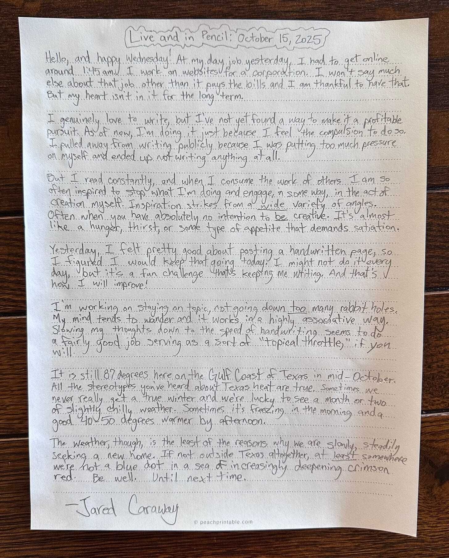 Yesterday, I felt pretty good about posting a handwritten page, so I figured I would keep that going today. I might not do it every day, but it’s a fun challenge that’s keeping me writing. And that’s how I will improve.